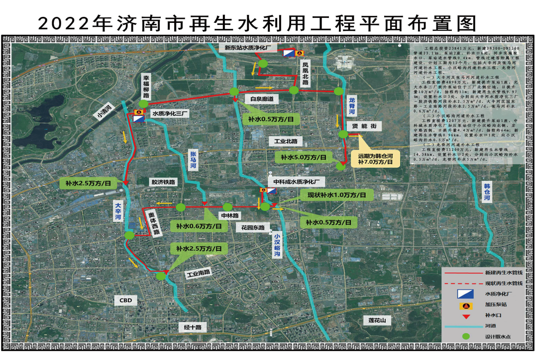 濟南市2022年再生水利用工程是一項防河道生態(tài)污染、保護河道生態(tài)環(huán)境的綜合治理工程,通過泵站加壓將水輸送到大辛河、張馬河、小漢峪溝和龍脊河河道上游,保證河道生態(tài)基流,實現(xiàn)河道水體良性循環(huán),達到改善河道水質的效果,進一步提高河道周邊居民生活的幸福感,同時滿足沿線市政雜用用水。