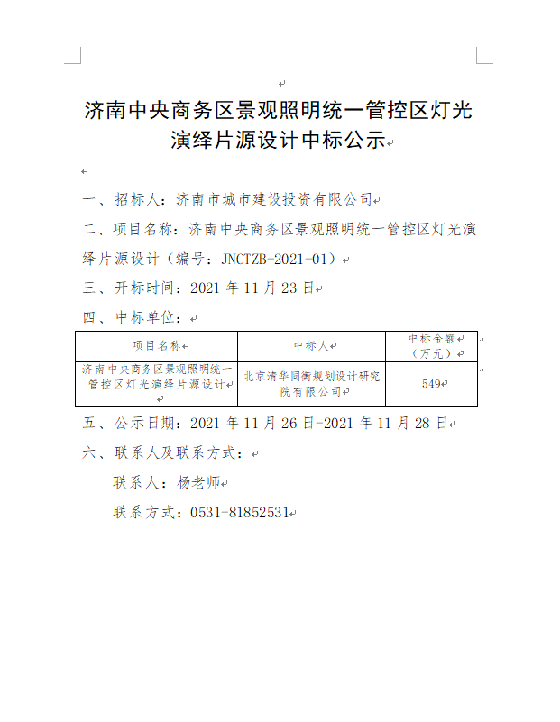 濟(jì)南中央商務(wù)區(qū)景觀照明統(tǒng)一管控區(qū)燈光演繹片源設(shè)計(jì)中標(biāo)公示