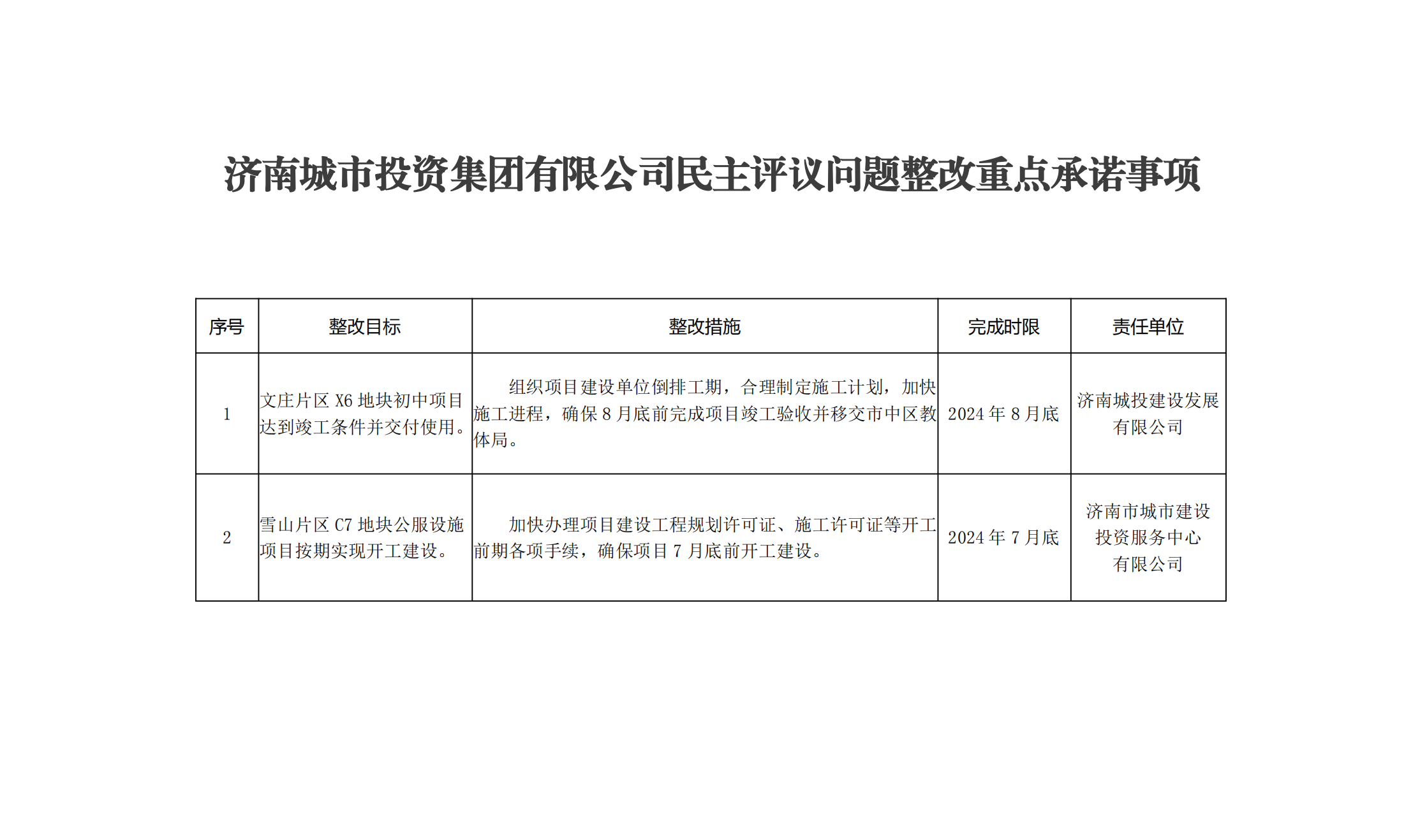 濟(jì)南城市投資集團(tuán)有限公司民主評(píng)議問(wèn)題整改重點(diǎn)承諾事項(xiàng)